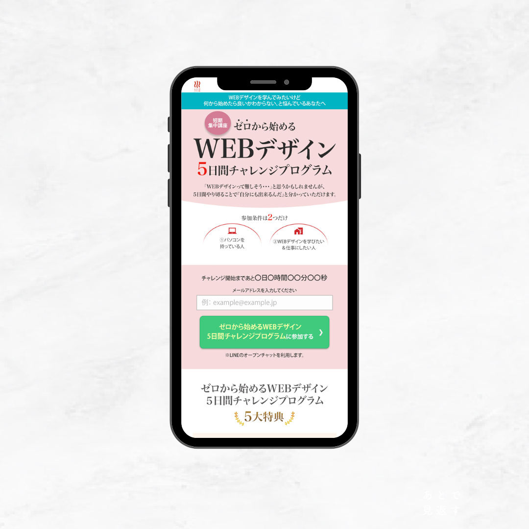 WEBデザイン 5日間チャレンジ LP 2025年8月23日 最終更新日時 : 2025年9月23日 chimudon-designlab 投稿テスト1のテキストがここに入ります 担当範囲:デザイン制作期間:5日使用ツール:Photoshop 概要 ターゲット 目的 デザインのポイント 1.ターゲットへの印象2.視覚効果のポイント3.デザイン効果
